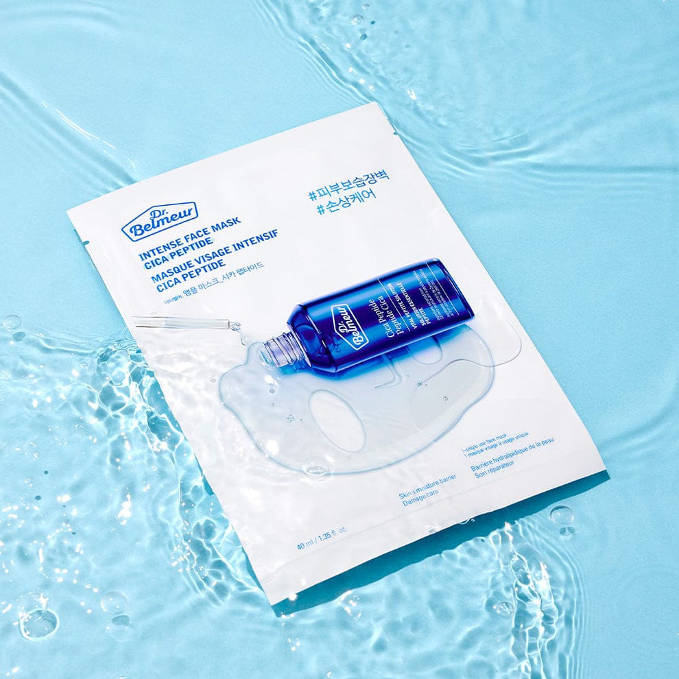 Dr. Belmeur Intense Face Mask Cica Peptide, un masque en tissu coréen enrichi en centella (cica) et peptides, conçu pour hydrater, apaiser et revitaliser les peaux sensibles ou irritées. Il s’agit d’un masque ampoule hydratant avec une essence riche, destiné à renforcer la barrière cutanée et à calmer la peau.